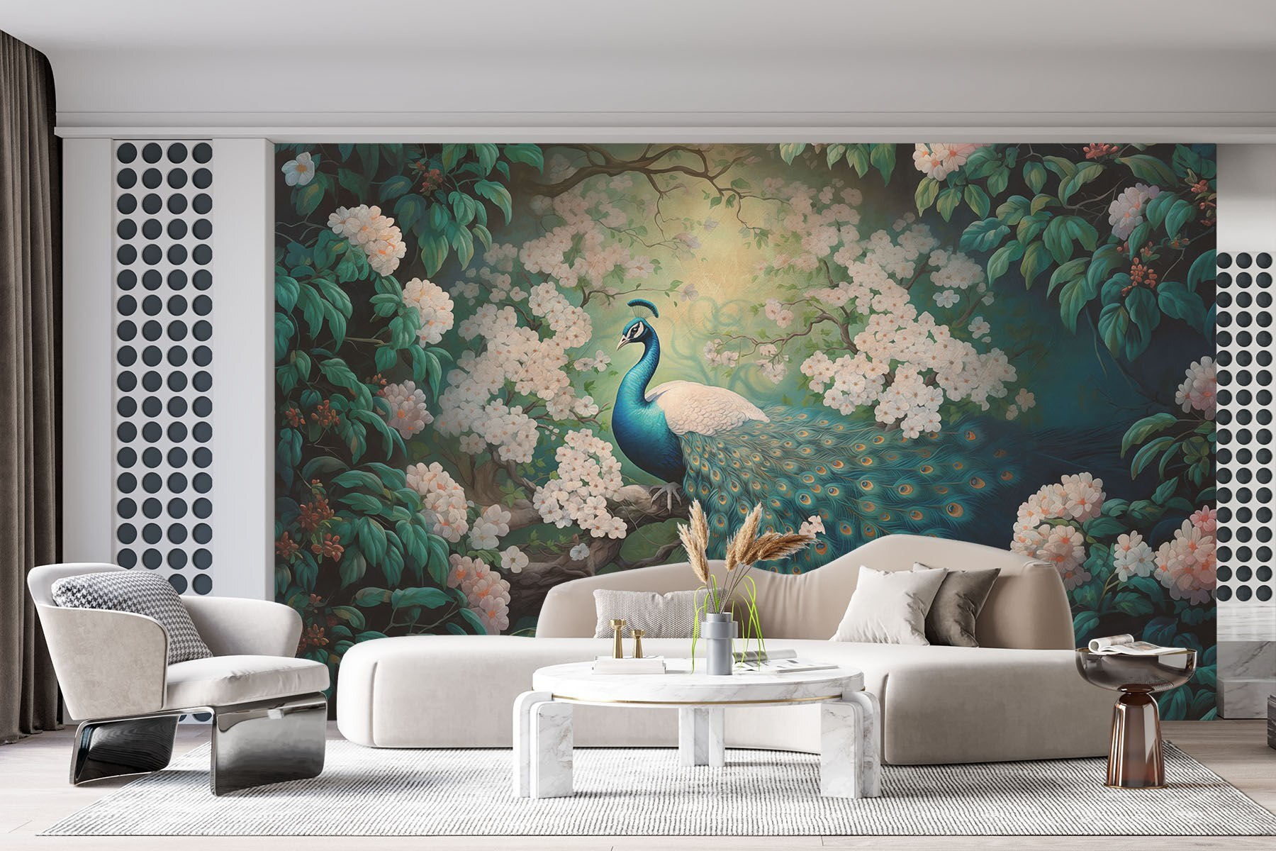 Transforme su espacio con este impresionante mural de pared con un pavo real posado graciosamente en la rama de un árbol, rodeado de delicadas flores. Es como invitar a un trozo de naturaleza a su hogar. Imagínese despertarse cada mañana con colores tan vibrantes: esos azules y verdes son sencillamente fascinantes. Además, puede que te sientas un poco elegante con un pájaro tan majestuoso como compañero de pared.