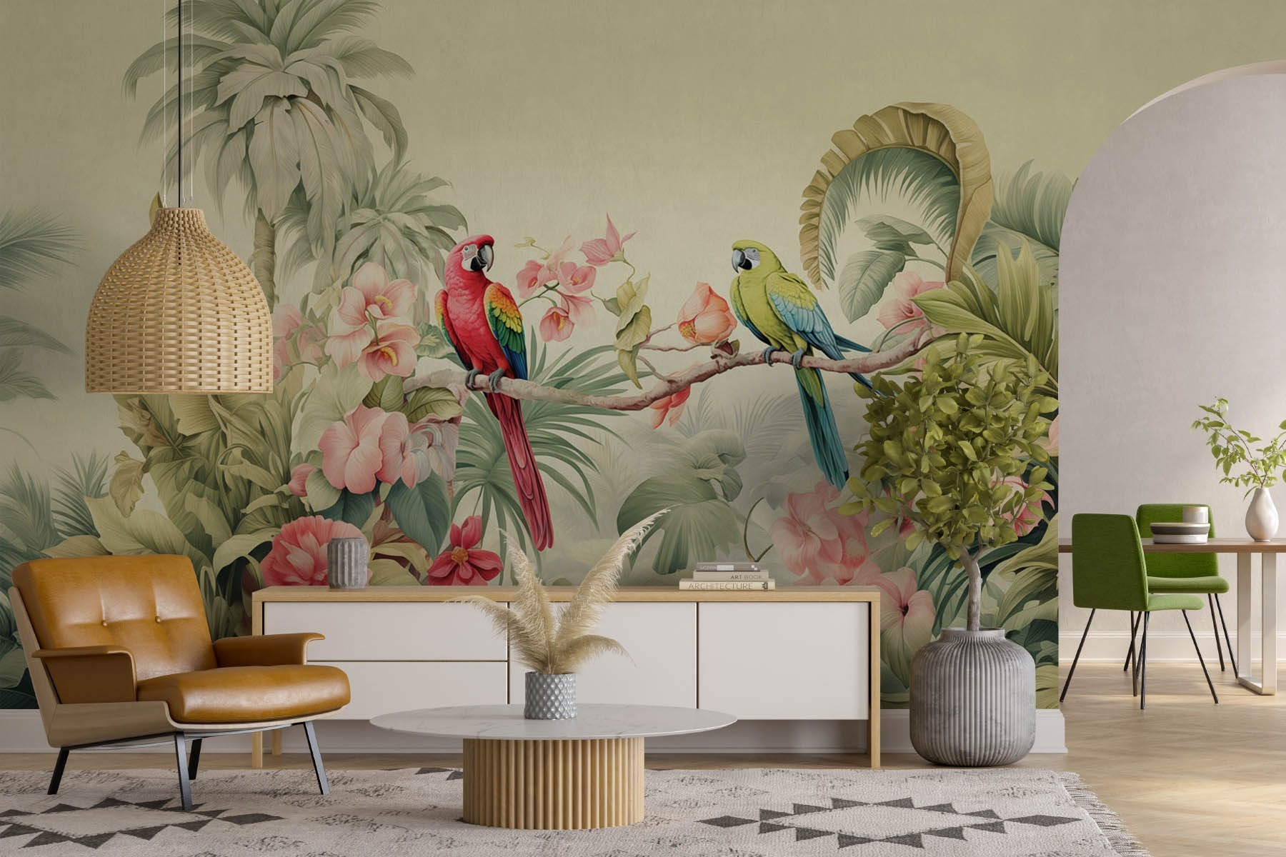 Transforme su espacio con este vibrante mural de pared con una encantadora pareja de loros posados graciosamente en una rama. Estos amigos emplumados aportan un toque de paraíso tropical a su hogar. Las exuberantes flores y hojas crean un ambiente sereno, por lo que es perfecto para un rincón de lectura acogedor o una sala de estar animada. Imagina tomarte el café de la mañana rodeado de este estallido de color: ¡es como estar siempre de vacaciones! Además, las vibraciones juguetonas de los loros podrían incluso inspirar algunas conversaciones descaradas. Disfruta de la belleza de la naturaleza y deja que tus paredes cuenten una historia.