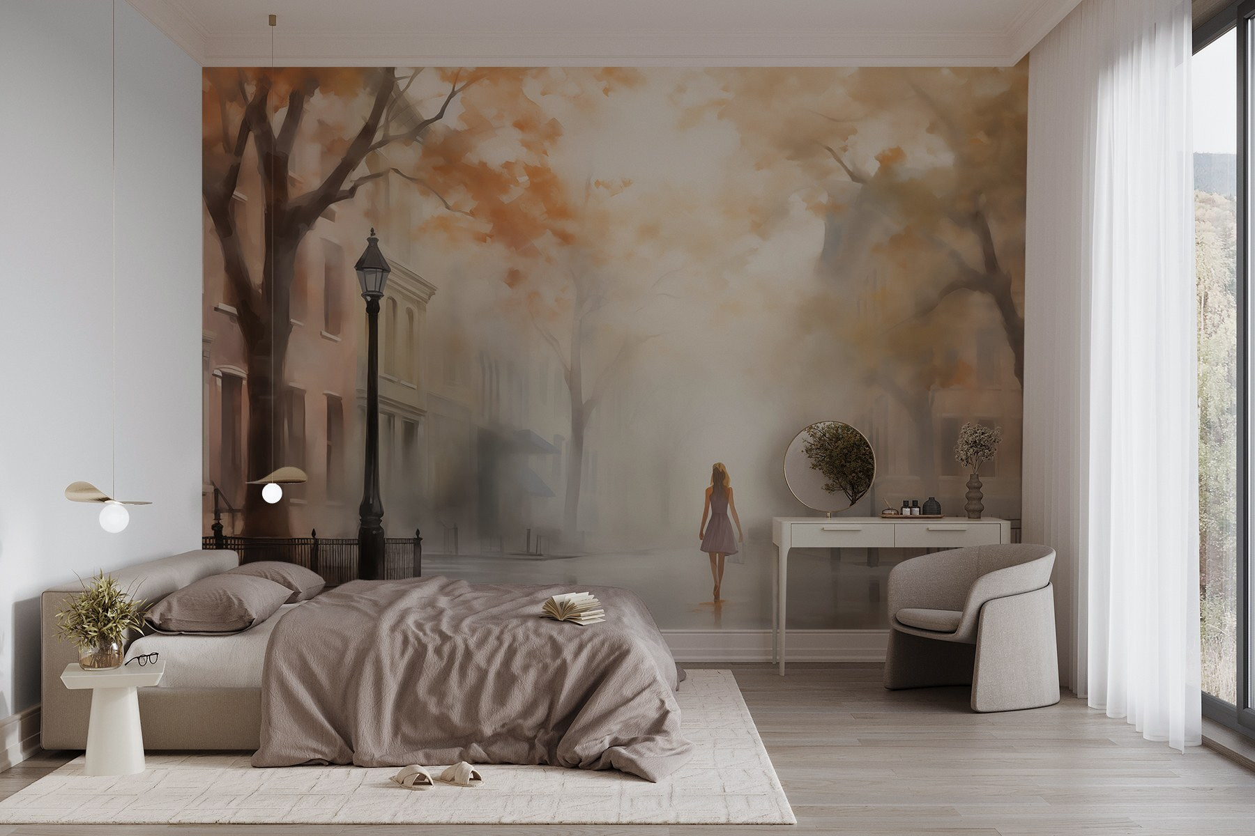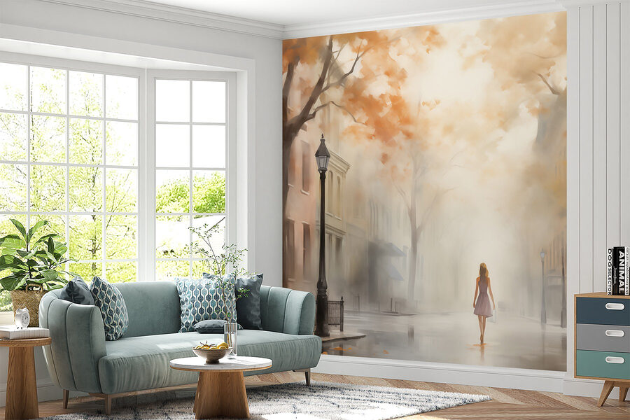 Imagínatelo: una mujer paseando por una calle brumosa, envuelta en los cálidos tonos del otoño. Este mural no es sólo arte: es una puerta a una escapada de ensueño. Imagínatelo iluminando tu salón o tu acogedor dormitorio, atrayendo a cualquiera que lo vea. La niebla crea una sensación de misterio, haciendo que cada mirada parezca una aventura. Además, ¿ese aire nostálgico? Perfecta para pasar las tardes recordando o planeando tu próxima escapada. Es como invitar a un trozo de serenidad de la vida de la ciudad a tu casa, un paso de ensueño a la vez, ¡qué ambiente!