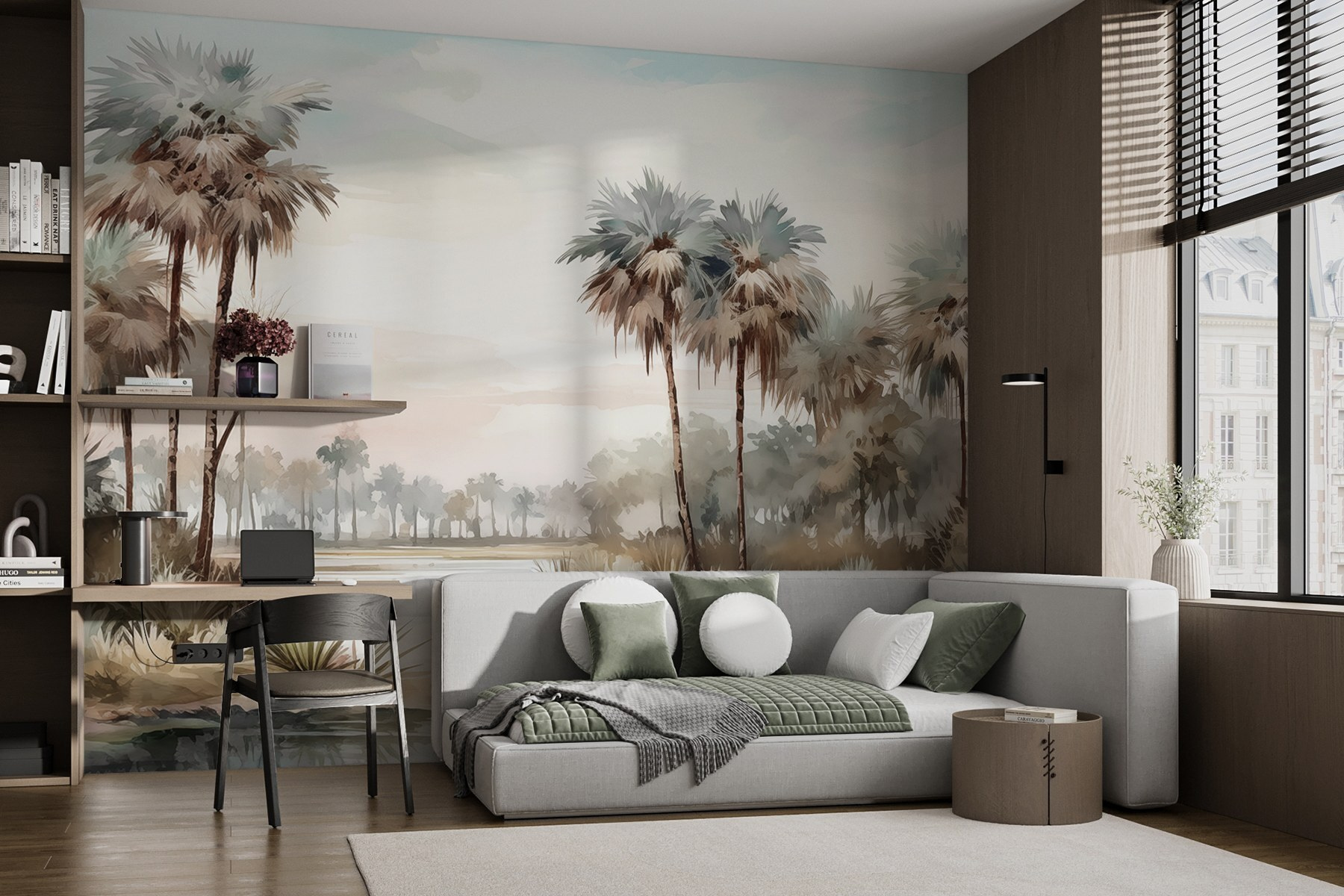 Transforme su espacio con este encantador mural, “Agua y palmeras junto a un río”. Imagínese que entra en una habitación donde las exuberantes palmeras se mecen suavemente sobre un río sereno, trayendo un trozo de paraíso directamente a su casa. Los colores suaves y los delicados trazos crean un ambiente tranquilo, perfecto para soñar despierto o simplemente para tomar un café mientras finge que está en una escapada a la playa.
