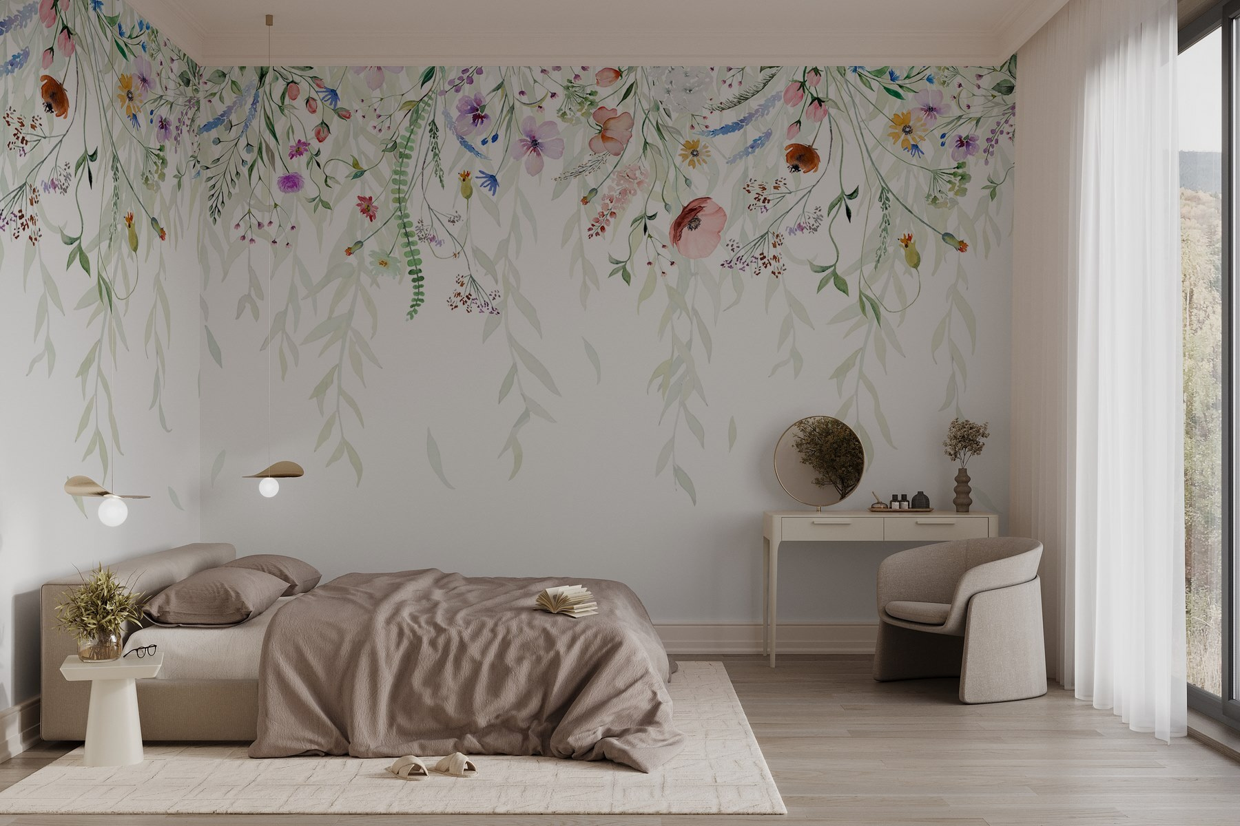 Transforme sus paredes con este impresionante mural de acuarela que presenta una encantadora cascada de flores y hojas. Es como llevar un toque de naturaleza al interior de su hogar: piense en las perezosas mañanas de domingo con una acogedora taza de café, rodeado de suaves flores. Los delicados colores y el diseño fluido crean un ambiente relajante, perfecto para cualquier habitación que busque un poco de personalidad. Imagínate recibir a tus amigos y ver cómo se les iluminan los ojos al admirar este precioso telón de fondo. Es una forma sencilla de dar a tu espacio un aire fresco y acogedor. Además, ¿a quién no le gusta un poco de magia floral?
