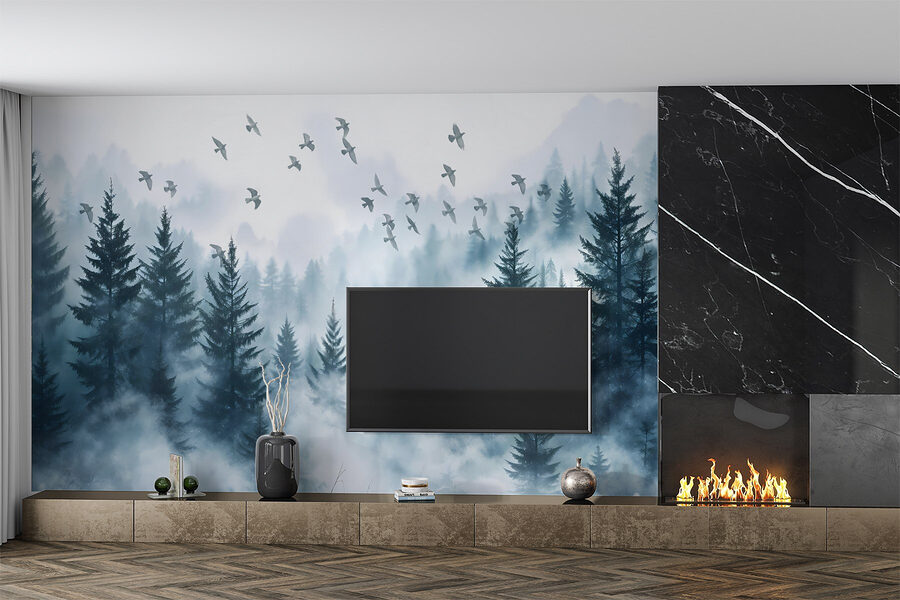 Transforme su espacio con el mural de pared “Pájaros volando sobre un bosque”, una escapada serena directamente en su salón. Imagínese entrar y ser recibido por un bosque brumoso, donde los pájaros vuelan entre los altos árboles. Es como entrar en un cuento de hadas de ensueño.