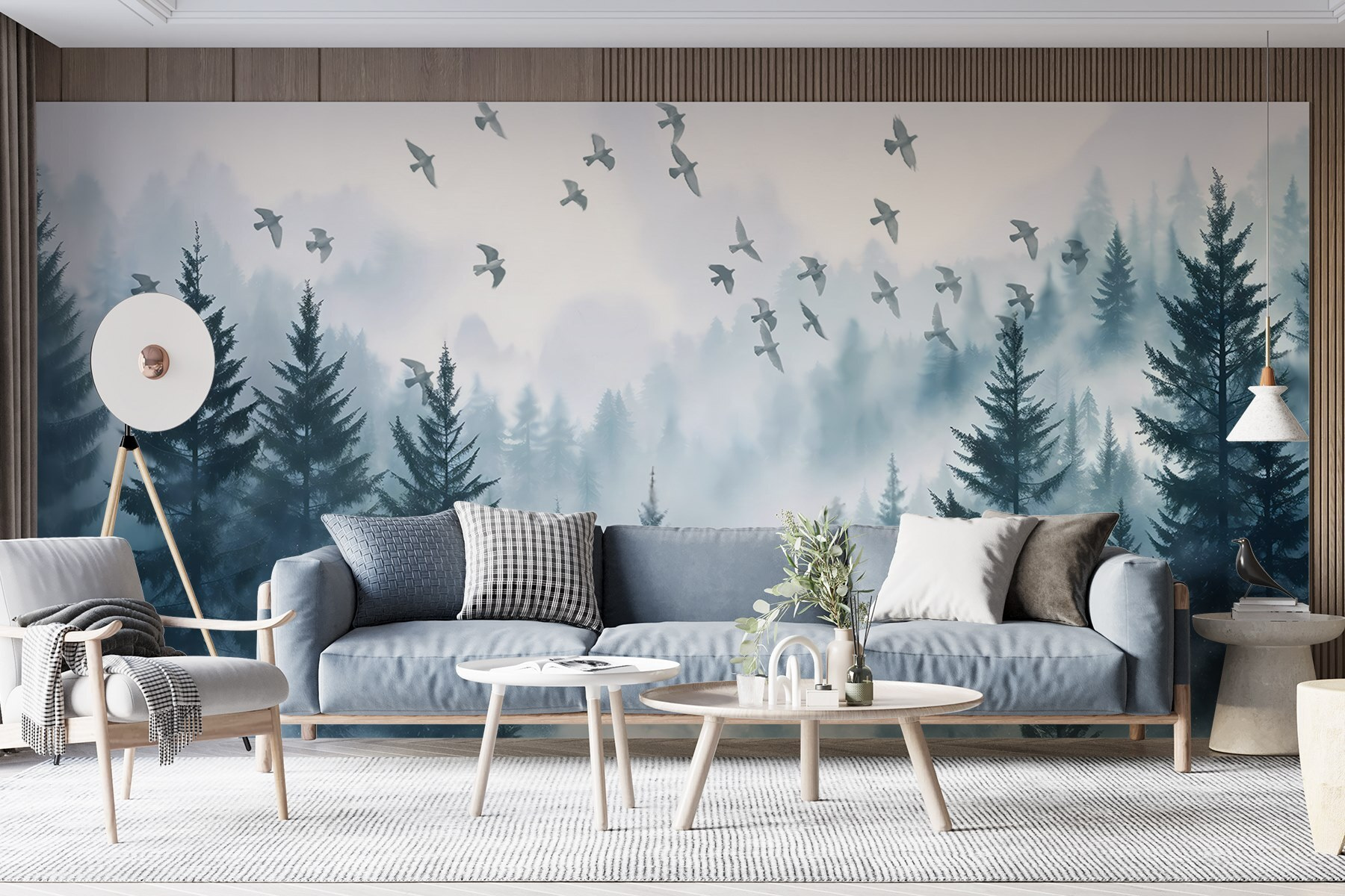Transforme su espacio con el mural de pared “Pájaros volando sobre un bosque”, una escapada serena directamente en su salón. Imagínese entrar y ser recibido por un bosque brumoso, donde los pájaros vuelan entre los altos árboles. Es como entrar en un cuento de hadas de ensueño.