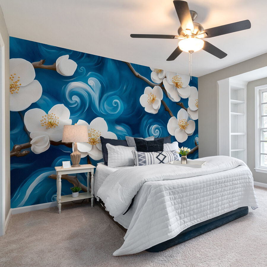 Imagina entrar en tu habitación y ser recibido por delicadas flores que bailan sobre un fondo arremolinado. Suena de ensueño, ¿verdad? Este mural, «Delicadas flores sobre un fondo arremolinado», lleva el encanto de un jardín japonés directamente a tu espacio. El llamativo contraste de los suaves pétalos blancos con los remolinos azul oscuro crea un ambiente sereno y a la vez dinámico. ¡Es como disfrutar de unas minivacaciones cada vez que entras! Perfecto para esos momentos en los que el caos del mundo se cuela en tu vida. Imagínate sentándote en tu sillón favorito, con una taza de té en la mano. Con este mural, es fácil olvidarse del ajetreo del exterior y perderse en su belleza. También es un tema de conversación encantador: ¿quién no querría hablar de un fondo tan impresionante? ¡Transforma tus paredes en un refugio tranquilo!