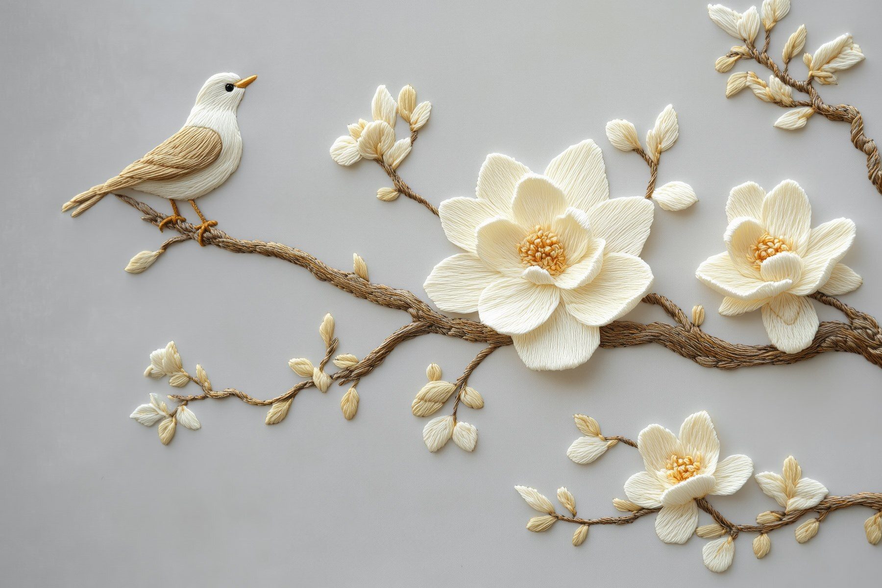 Transforme cualquier espacio en un oasis de serenidad con el mural «Pájaro en una rama con flores». Esta encantadora obra muestra un pájaro posado entre elegantes flores, que recuerda a un tranquilo día de primavera. Imagine llegar a casa y encontrarse con esta belleza, que evoca calidez y tranquilidad, perfecta para un rincón acogedor o un dormitorio tranquilo.