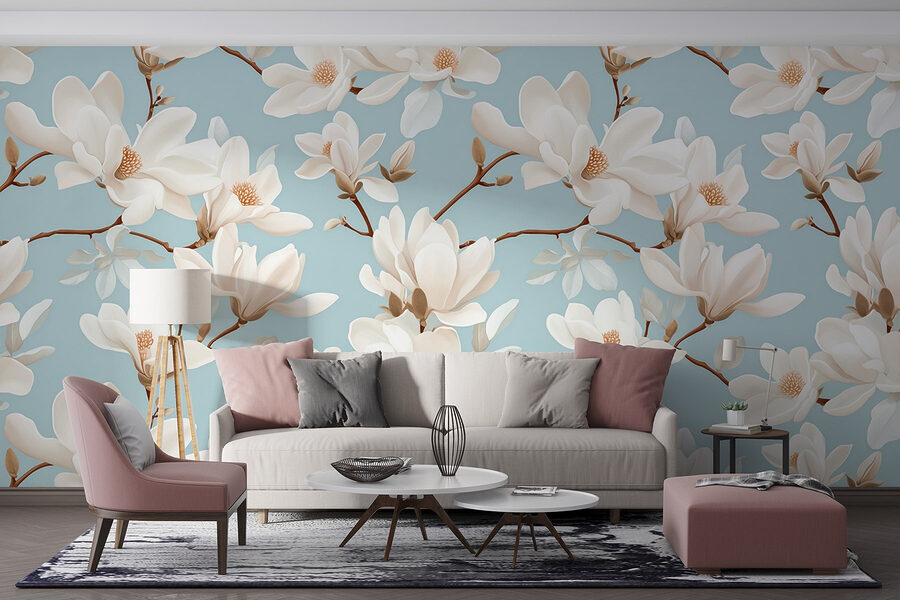 Transforma tu espacio con el impresionante «Patrón de flores blancas para murales». Imagina entrar en una habitación donde florecen elegantes magnolias sobre un relajante fondo azul cielo. ¡Es como tener la primavera en tu hogar durante todo el año! Los delicados pétalos y los suaves colores crean un ambiente relajante, perfecto para descansar después de un largo día o acurrucarse con un buen libro. ¡Tus amigos entrarán y pensarán que te has escondido en un exuberante jardín! Además, es un recordatorio de que la belleza puede estar a solo una pared de distancia. ¿Quién diría que la decoración del hogar podía ser tan refrescante y alegre?