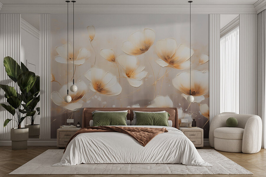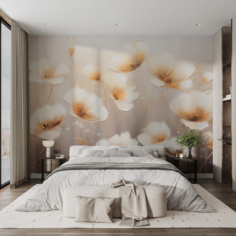 Imagina entrar en una habitación que parece una suave mañana de primavera gracias a este impresionante mural. Titulado «Mural con flores sobre fondo blanco», captura delicadas flores que bailan sobre un fondo suave y acogedor. Es como llevar un jardín al interior sin necesidad de una regadera.