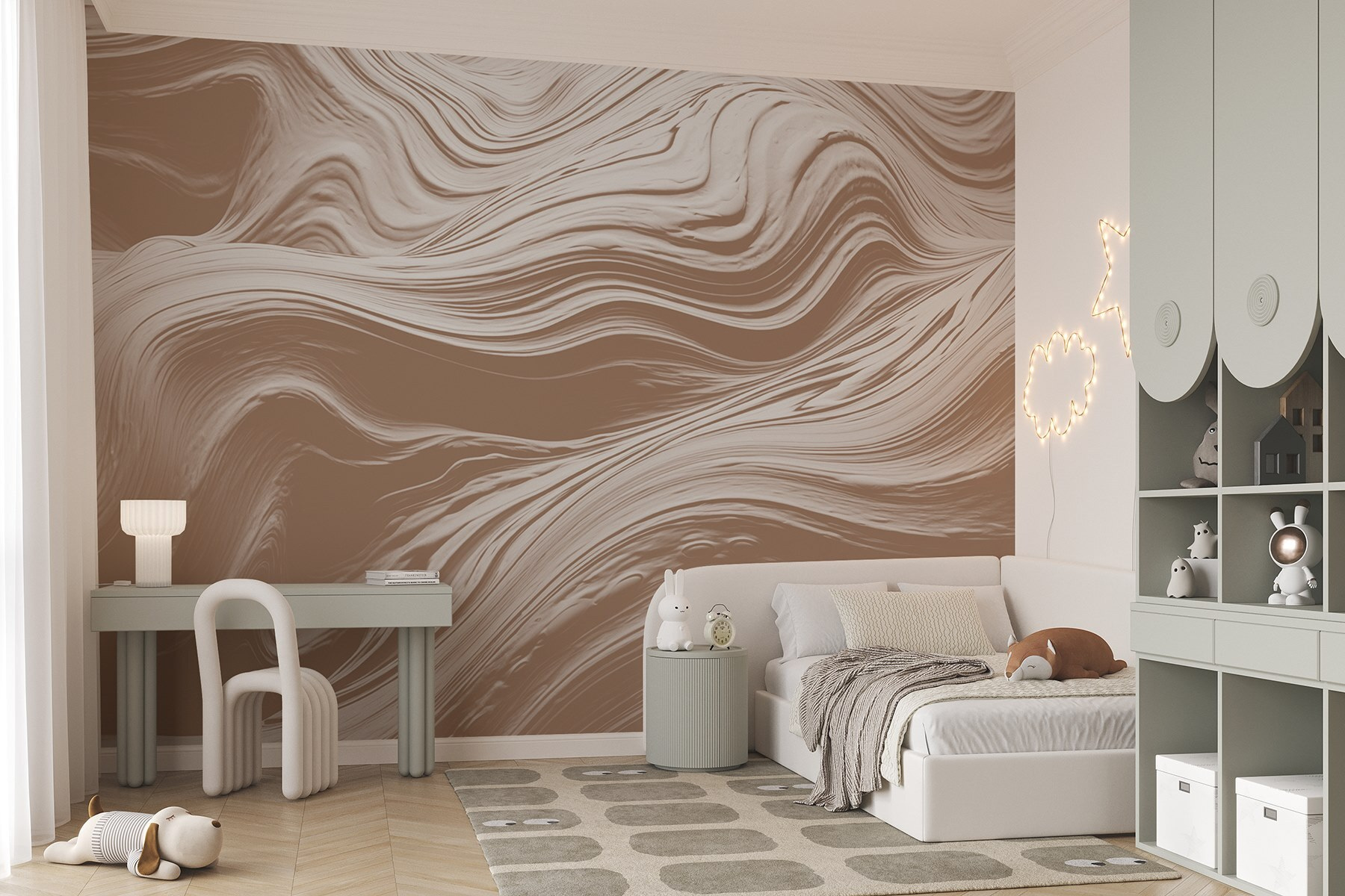 Transforme cualquier habitación con este cautivador mural de pared con remolinos blancos sobre un fondo suave y terroso. Aporta un toque de elegancia moderna que resulta a la vez relajado y elegante. Imagínese entrar en un espacio donde las paredes parecen fluir con suaves olas, es casi como una habitación de ensueño. Perfecto para una sala de estar o un dormitorio sereno, el sutil encanto de este mural invita a momentos de pausa. ¡Los invitados no querrán irse! Además, es tan fácil de instalar que puede que encuentres tiempo para preparar unas galletas como dulce proyecto secundario. De verdad, ¿quién no quiere un refugio acogedor que despierte la alegría?