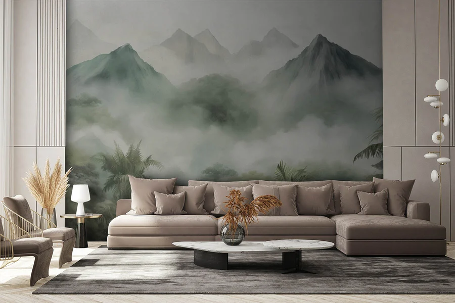 Transform your space into a tranquil escape with this stunning “Foggy Landscape with Mountains and Trees” mural. Imagine sinking into your couch while gazing at misty mountains that seem to whisper secrets of the wilderness. The lush greenery brings a slice of the jungle right into your living room—perfect for daydreaming or planning your next adventure.