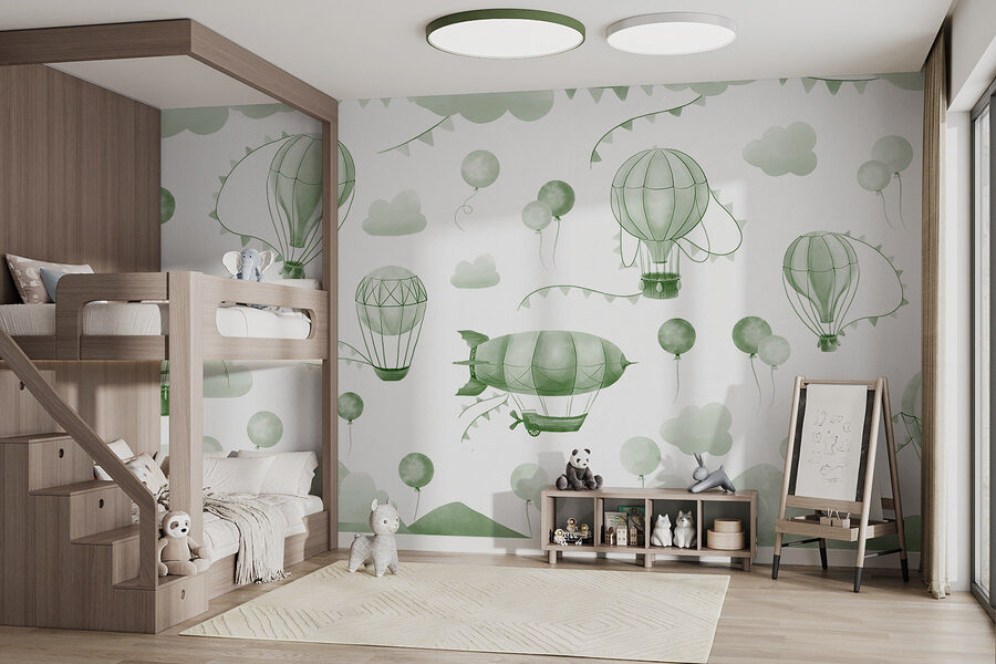 Transforme su espacio con este encantador mural de pared que presenta una caprichosa mezcla de globos verdes y suaves siluetas de montañas. Es como entrar en un sueño o en un alegre mundo de dibujos animados donde los globos aerostáticos flotan perezosamente en el cielo, aportando una sensación de asombro y aventura. Imagina una acogedora habitación iluminada por estos suaves tonos, una invitación a la paz interior y a soñar despierto. Es perfecto para los niños o cualquier persona joven de corazón. Ver esos globos elevarse puede despertar alegría y nostalgia, recordándonos días soleados llenos de risas y exploración. Este mural podría ser el telón de fondo perfecto para la hora del cuento o simplemente para un momento tranquilo tomando el té. No es sólo decoración, ¡es una pequeña escapada feliz!