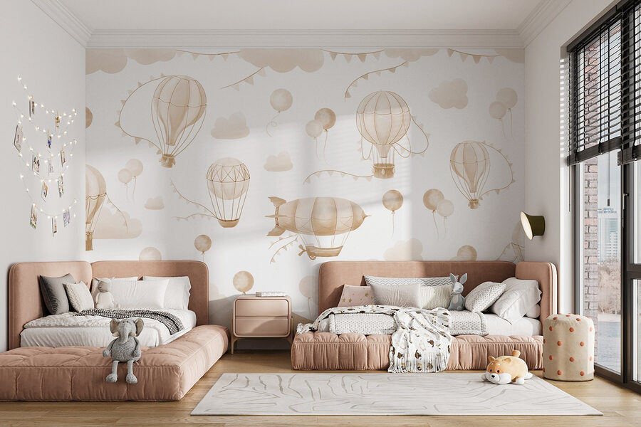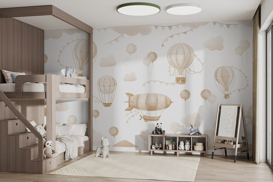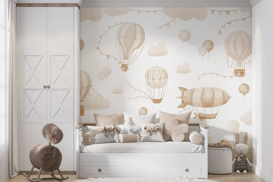 Transforme cualquier habitación con este caprichoso mural que muestra un animado grupo de globos aerostáticos a la deriva sobre suaves montañas. Es como llevar un trozo de aventura al interior, donde cada mirada parece un vistazo al cielo infinito. Los tonos suaves invitan a un ambiente relajado, perfecto para espacios acogedores donde los sueños cobran vida. Imagínate tomando el té mientras ves flotar estos encantadores globos, cada uno de ellos despertando un poco de imaginación. Ya sea en la habitación de un niño o en un rincón creativo, este mural añade un delicioso toque de alegría, recordando a todos que siempre hay que apuntar alto y soñar a lo grande.