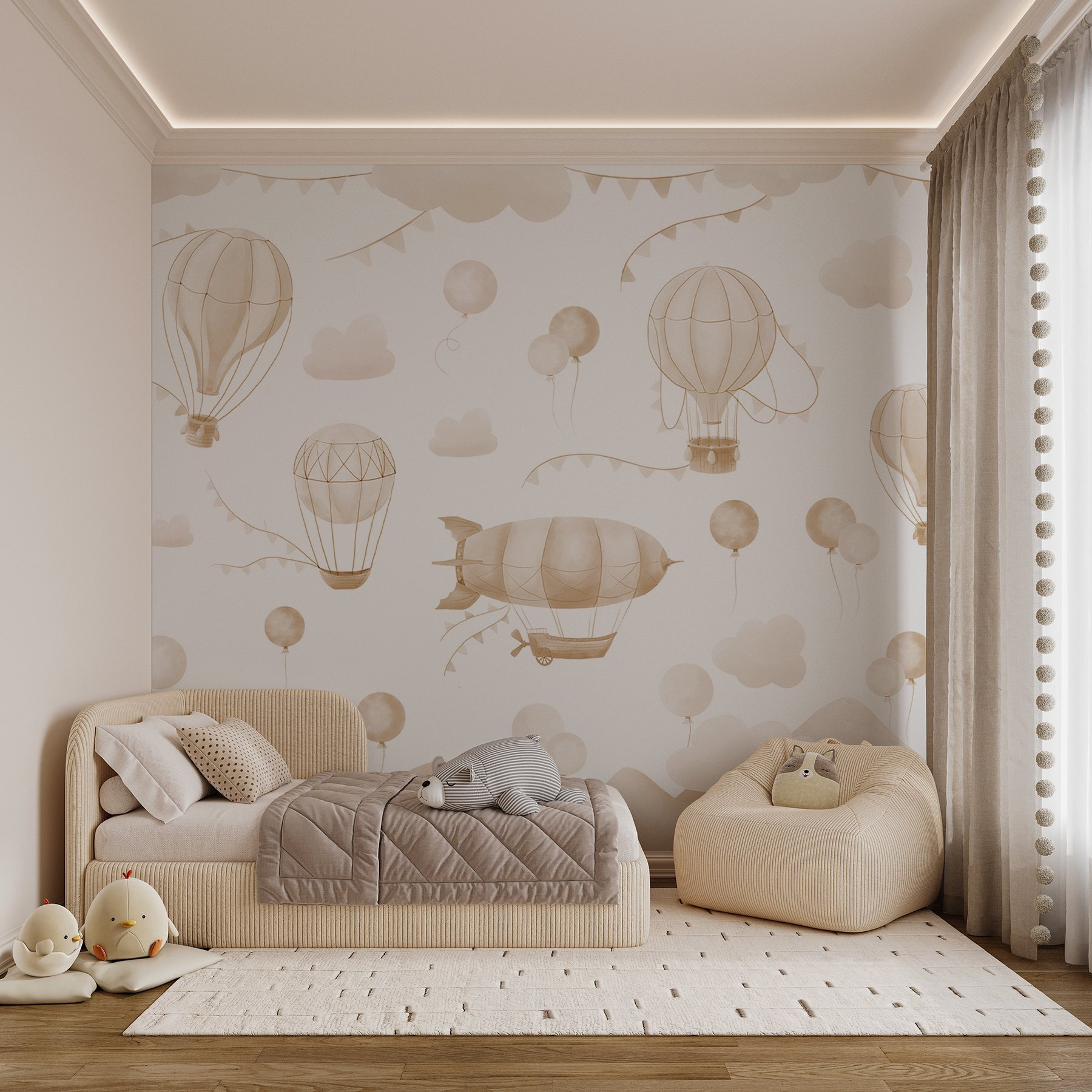 Transforme cualquier habitación con este caprichoso mural que muestra un animado grupo de globos aerostáticos a la deriva sobre suaves montañas. Es como llevar un trozo de aventura al interior, donde cada mirada parece un vistazo al cielo infinito. Los tonos suaves invitan a un ambiente relajado, perfecto para espacios acogedores donde los sueños cobran vida. Imagínate tomando el té mientras ves flotar estos encantadores globos, cada uno de ellos despertando un poco de imaginación. Ya sea en la habitación de un niño o en un rincón creativo, este mural añade un delicioso toque de alegría, recordando a todos que siempre hay que apuntar alto y soñar a lo grande.