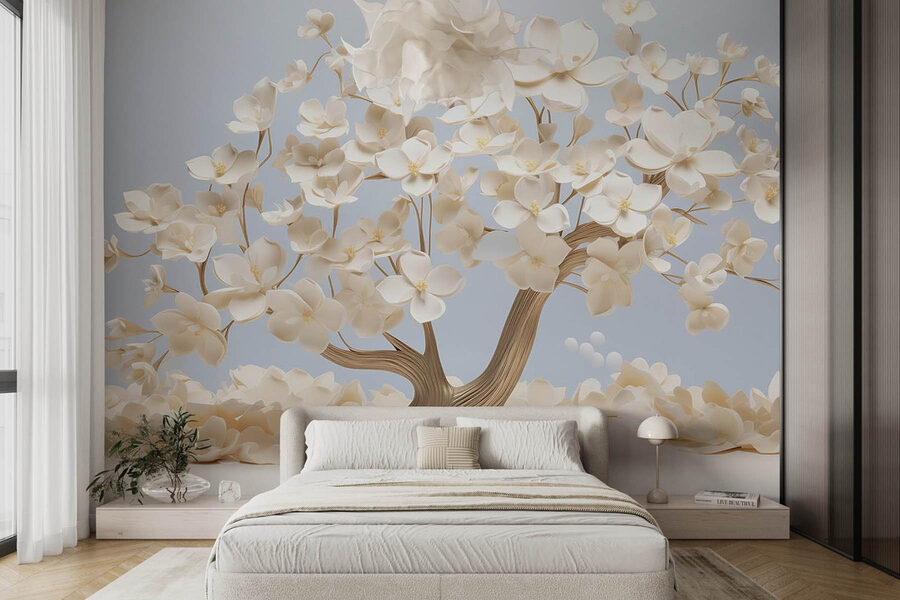Transforma tu espacio con el encantador «Mural de árbol con flores blancas». Imagina entrar en una habitación y ser recibido por un árbol sereno y floreciente que susurra tranquilidad. Las suaves y delicadas flores crean un ambiente apacible, perfecto para soñar despierto o simplemente escapar del caos diario. Es como tener un pedazo de jardín japonés en casa: ¿quién no querría tomar un té frente a tanta belleza?