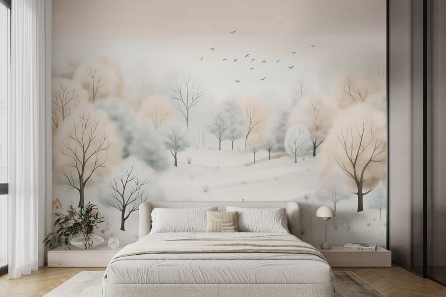 Transforma cualquier habitación en un acogedor paraíso invernal con este impresionante mural «Paisaje nevado con árboles y pájaros». Imagina una suave nevada, con árboles helados que se mecen suavemente mientras los pájaros vuelan por encima. Es como llevar la calma de la naturaleza directamente a tu salón, sin aire frío, solo pura serenidad. Los tonos neutros crean una atmósfera tranquila que puede alegrar incluso los días más sombríos. Ya sea en un rincón de lectura tranquilo o en una animada sala de estar, este mural crea el ambiente perfecto. Imagínate tomando un chocolate caliente envuelto en una manta cálida, contemplando esta escena serena: ¡es un pedazo de la magia del invierno, sin el frío!