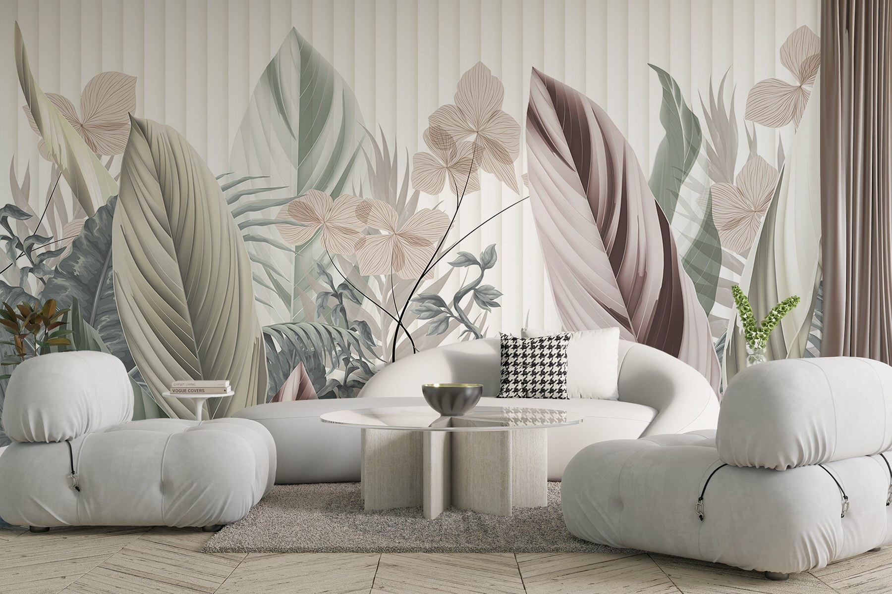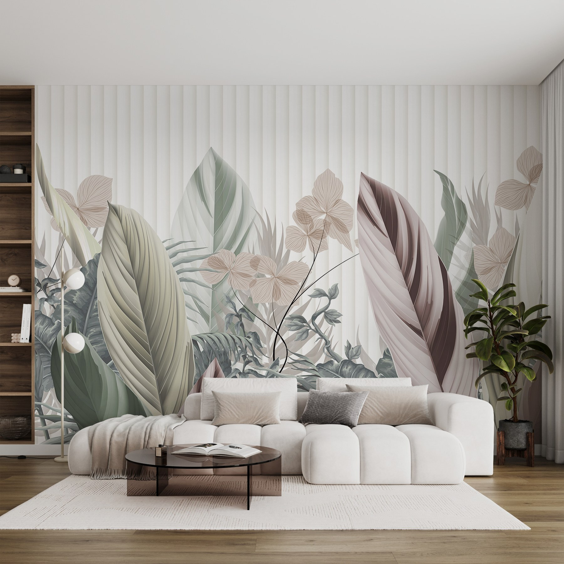 Transforme su espacio con este encantador mural de pared, “Elegancia natural en tonos apagados”. Imagínese adentrándose en un sereno jardín cada vez que entre en la habitación. La suave paleta de hojas y diseños florales se siente como una suave brisa susurrando entre los árboles. Es como llevar el aire libre a tus paredes, ¡sin necesidad de ser jardinero!