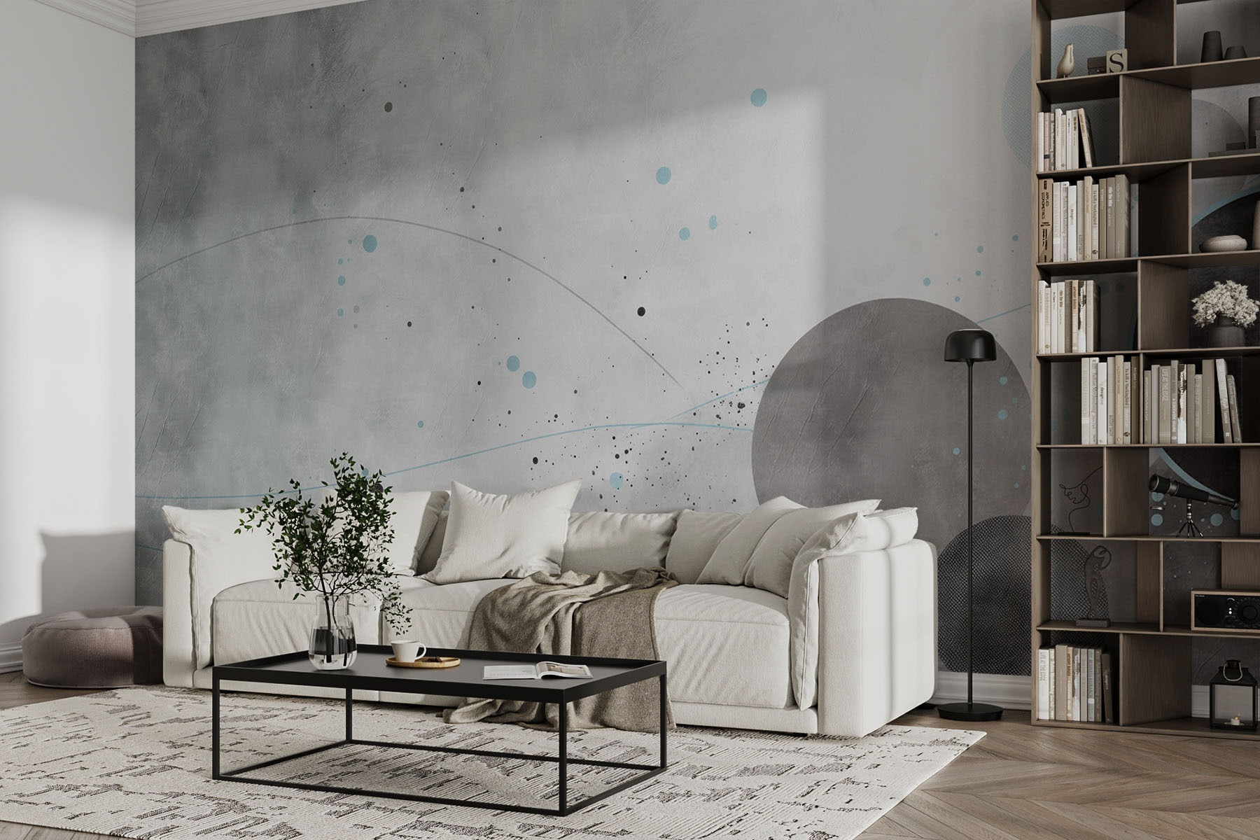 Adéntrese en un mundo de vibraciones tranquilizadoras con este mural de pared que presenta círculos en tonos grises y azules, acompañados de suaves líneas que parecen danzar por la superficie. Es como una conversación entre colores, susurrando secretos de serenidad y creatividad. Imagínese tomando su café matutino en un rincón acogedor, con los suaves tonos envolviéndole como un cálido abrazo. Perfecto para una estética moderna, este mural invita a soñar despierto y a pensar en profundidad. Ya sea en la sala de estar o en un espacio creativo, establece el tono adecuado, invitando a la vez que refrescante y vibrante. Despídete de las paredes aburridas y da la bienvenida a un toque de inspiración.