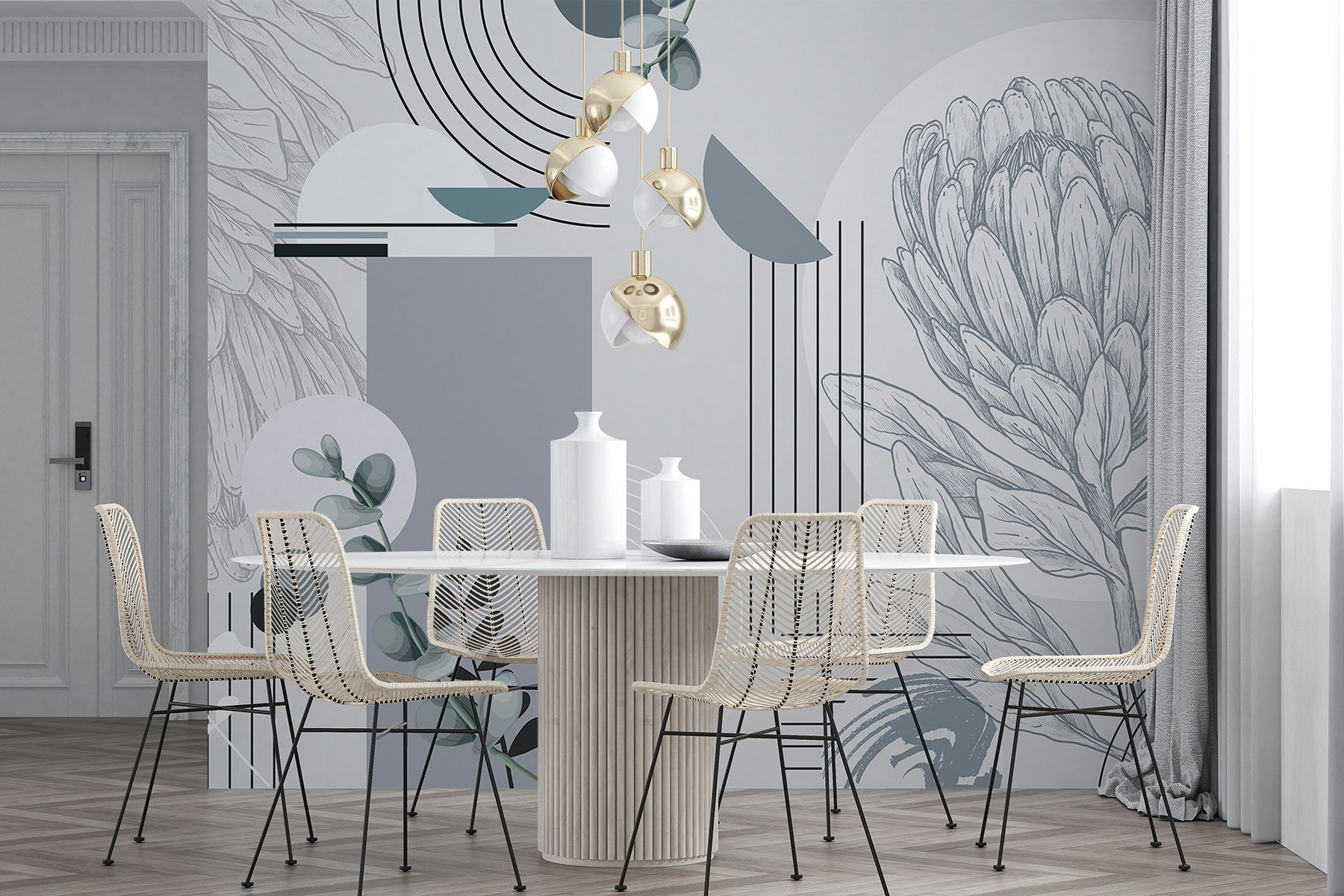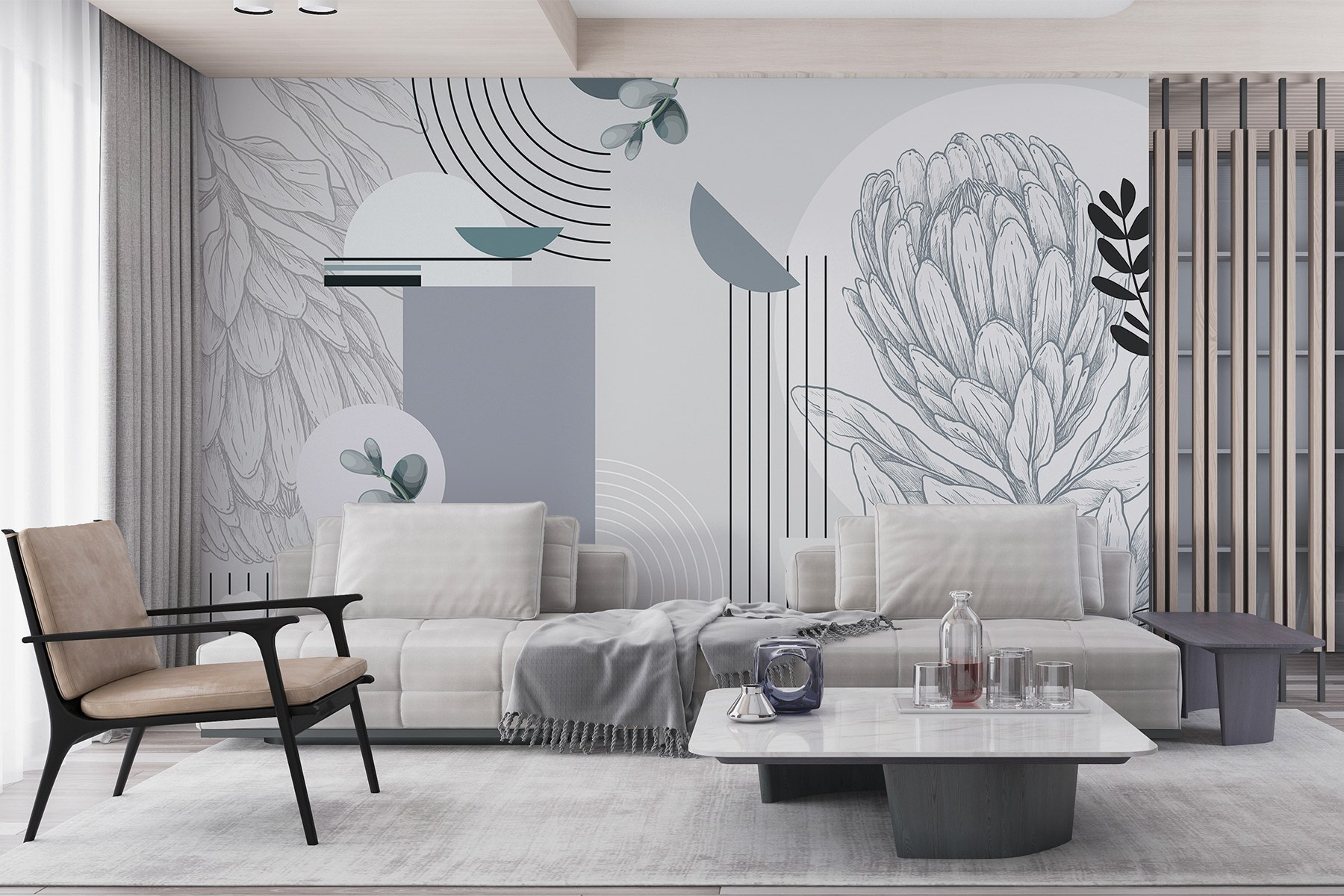 Transforme cualquier espacio con este impresionante mural de pared con intrincadas flores y hojas. Imagina que entras en una habitación donde la naturaleza te susurra – este diseño trae esa sensación directamente a tus paredes. Los colores fríos y los patrones únicos crean un ambiente sereno, por lo que es perfecto para un rincón de lectura acogedor o una sala de estar animada. Es como llevar un soplo de aire fresco al interior sin necesidad de tener un pulgar verde. ¿Observar el juego de luces de las hojas? Pura magia. Deja que este mural sea el telón de fondo de tus mejores recuerdos, desde las perezosas mañanas de domingo hasta las reuniones llenas de risas. No es sólo decoración, ¡es una experiencia!