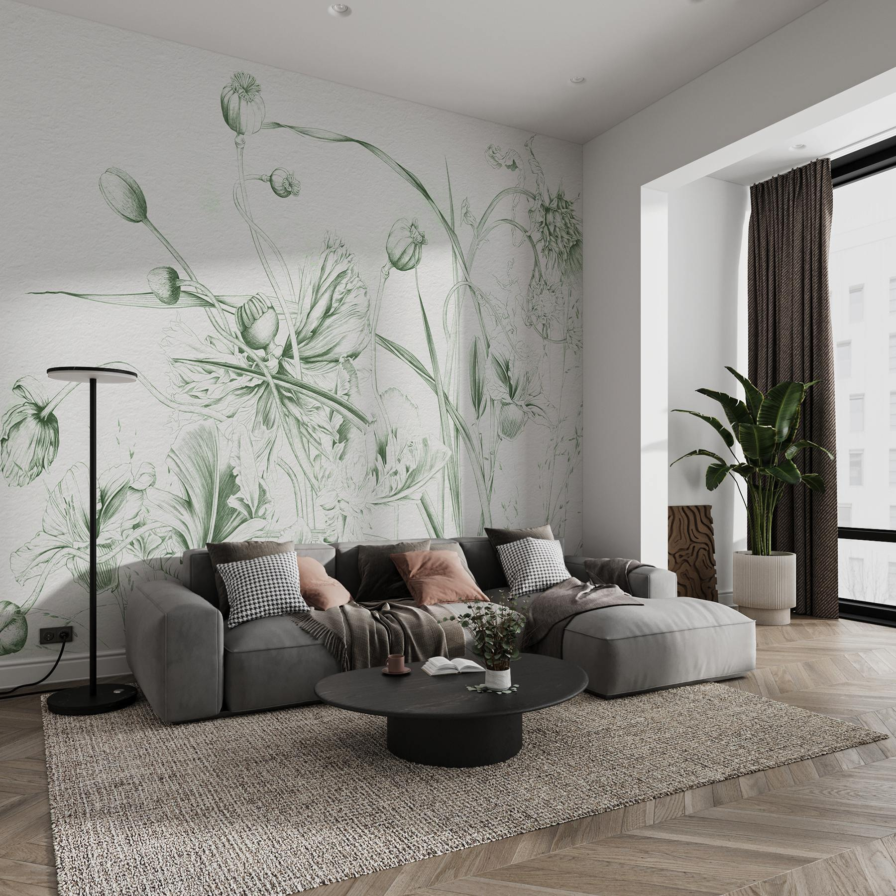 Transforme cualquier habitación en un acogedor refugio con este impresionante mural de pared que presenta una delicada danza de flores y hojas. Imagínese tomar un café rodeado de obras de arte de la naturaleza: ese suave toque de verdor hace maravillas para el alma. Es como llevar un sereno jardín al interior, sin tener que preocuparse de regarlo o de los molestos insectos. Ya sea en un salón, un dormitorio o incluso un pasillo, este mural invita a la calidez y la calma. Y puntos extra por inspirar la creatividad. Perfecto tanto para los que sueñan despiertos como para los amantes del arte. Es como tener una galería botánica en la pared.