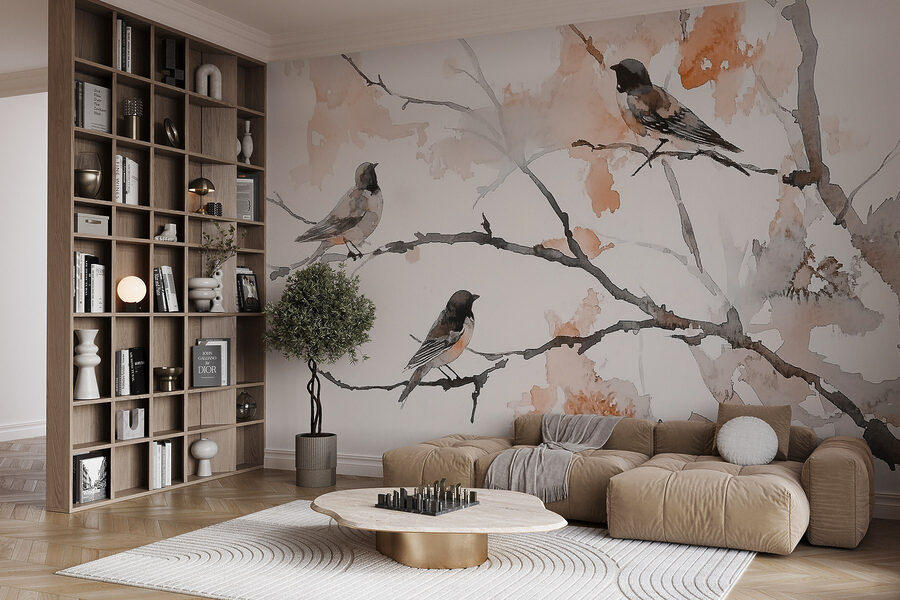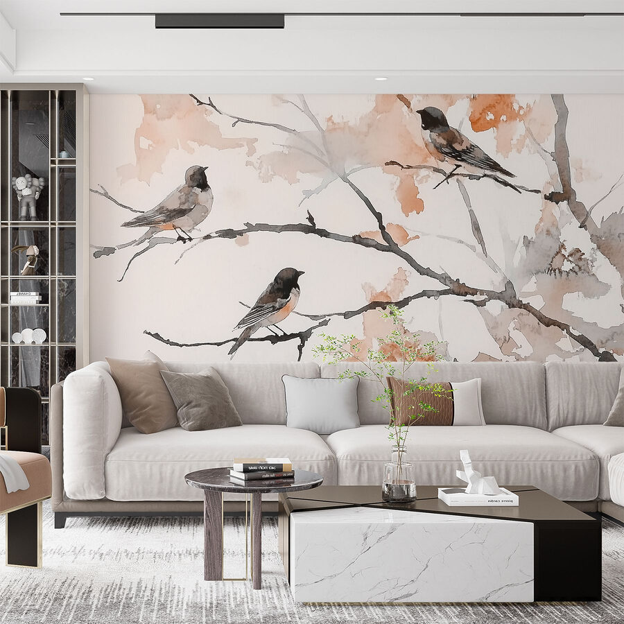 Transforme cualquier pared en una escapada serena con este cautivador mural que muestra un grupo de pájaros posados en delicadas ramas. Las suaves pinceladas de acuarela aportan un suave encanto, invitando a un poco de naturaleza en su espacio. Imagínese entrando en un rincón acogedor lleno de tranquilidad, donde estos pequeños compañeros aviares parecen cantar todo el día. Este mural no sólo cuelga, sino que respira vida, instándole a hacer una pausa, reflexionar y tal vez tomar una taza de té mientras disfruta de la vista. Es como tener un trozo del aire libre en el interior, perfecto para dar un toque encantador a cualquier habitación.